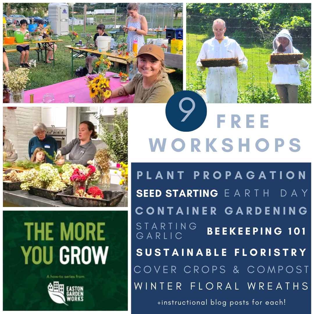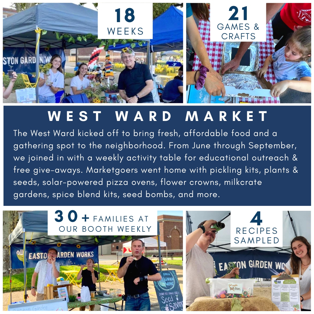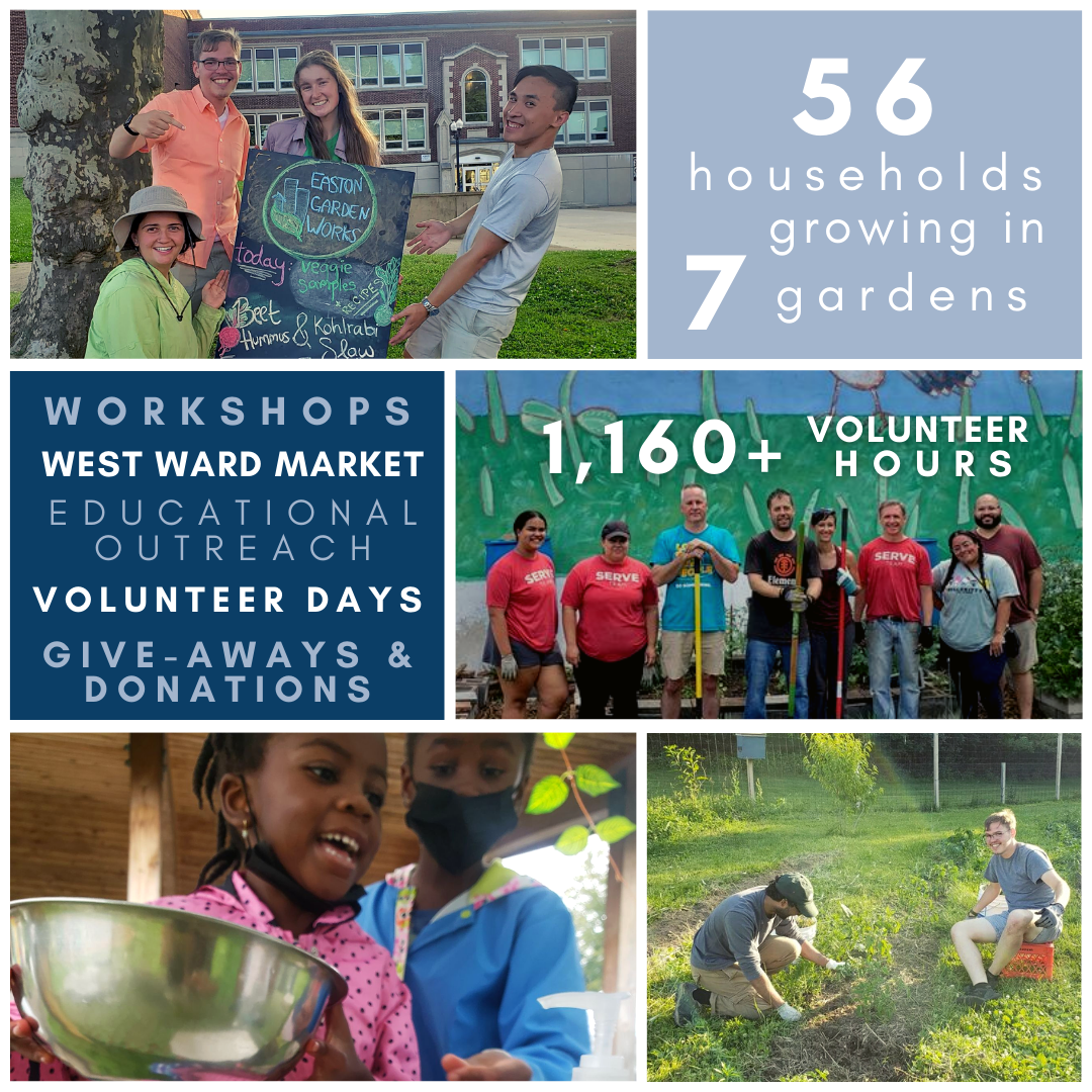 Cheers to another year! It means so much to us (and Easton) when people volunteer, grow their own veggies, and attend events at the gardens. Flip through the infographics below for a recap of a new market in the West Ward, new workshop series, plus more volunteers, events, and flower crowns which made this year awesome.