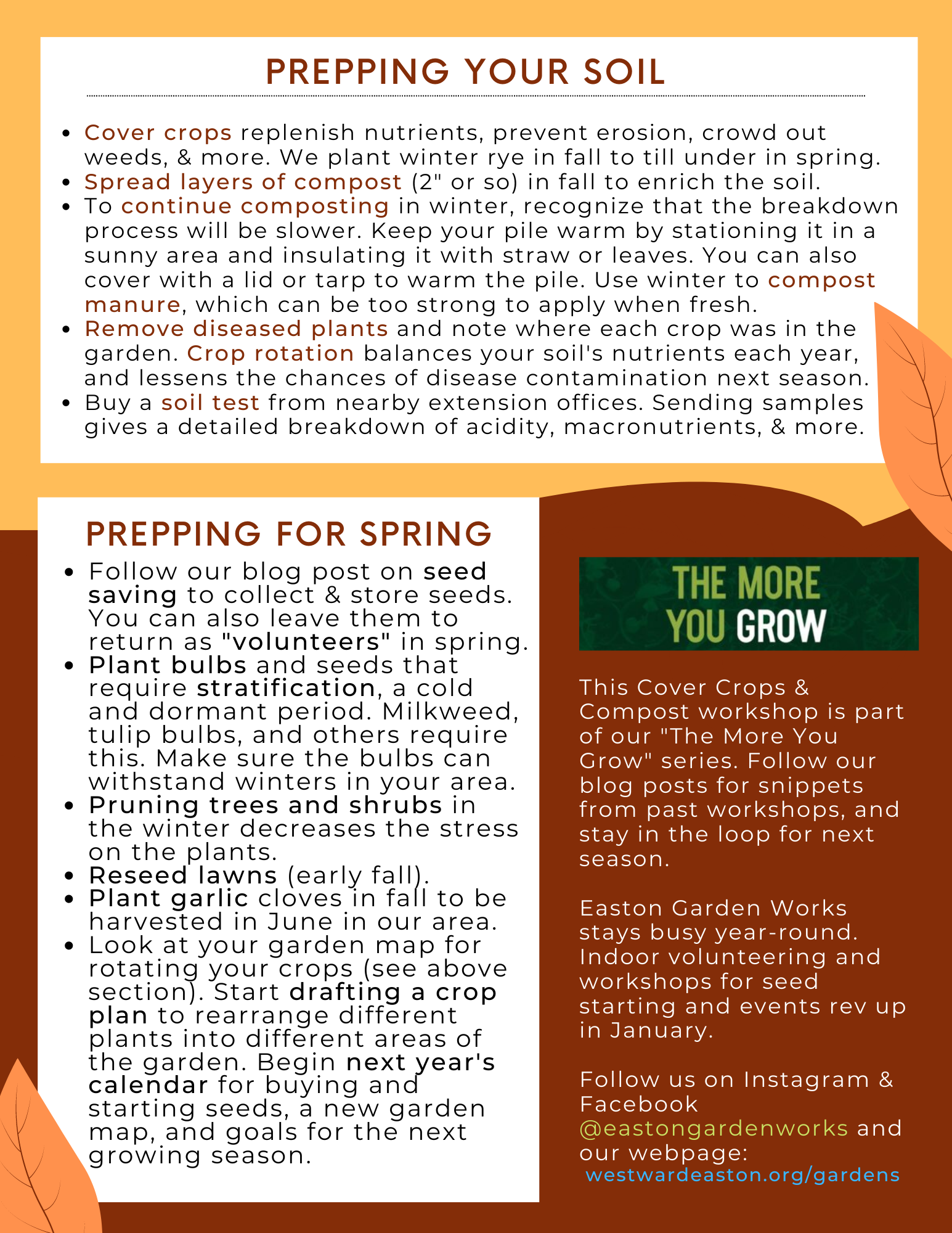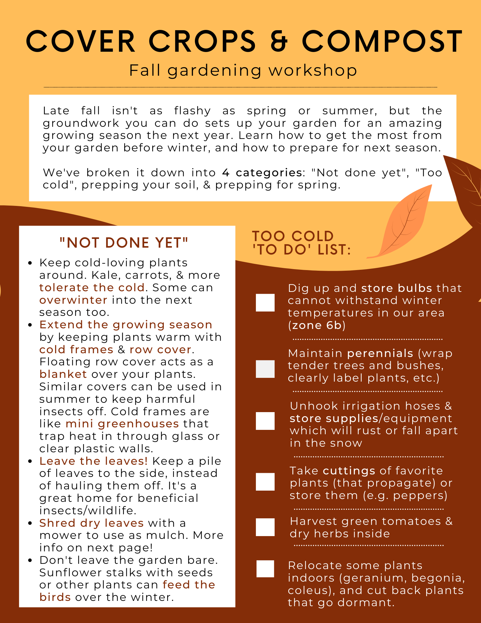 - Crop plans map out when and where you’ll plant crops over the season. It is useful to start in fall if you have any crops that are overwintering (e.g. mark down where garlic or cover crops were planted). Since not all crops will remain in one place all season (i.e. garlic is harvested in June, leaving you with more space to plant later), crop plans schedule next gardening season which helps you purchase the right seeds and supplies ahead of time.