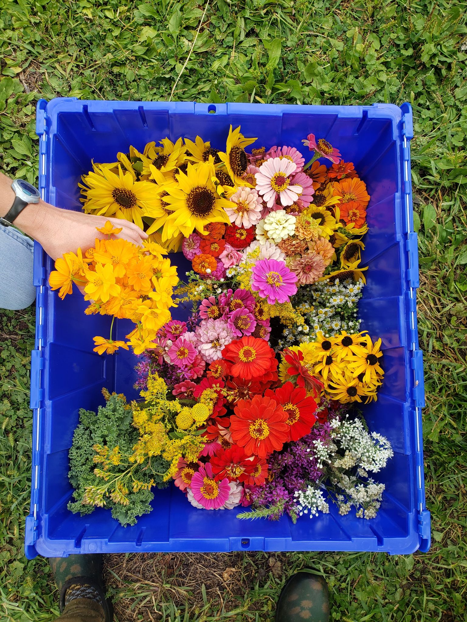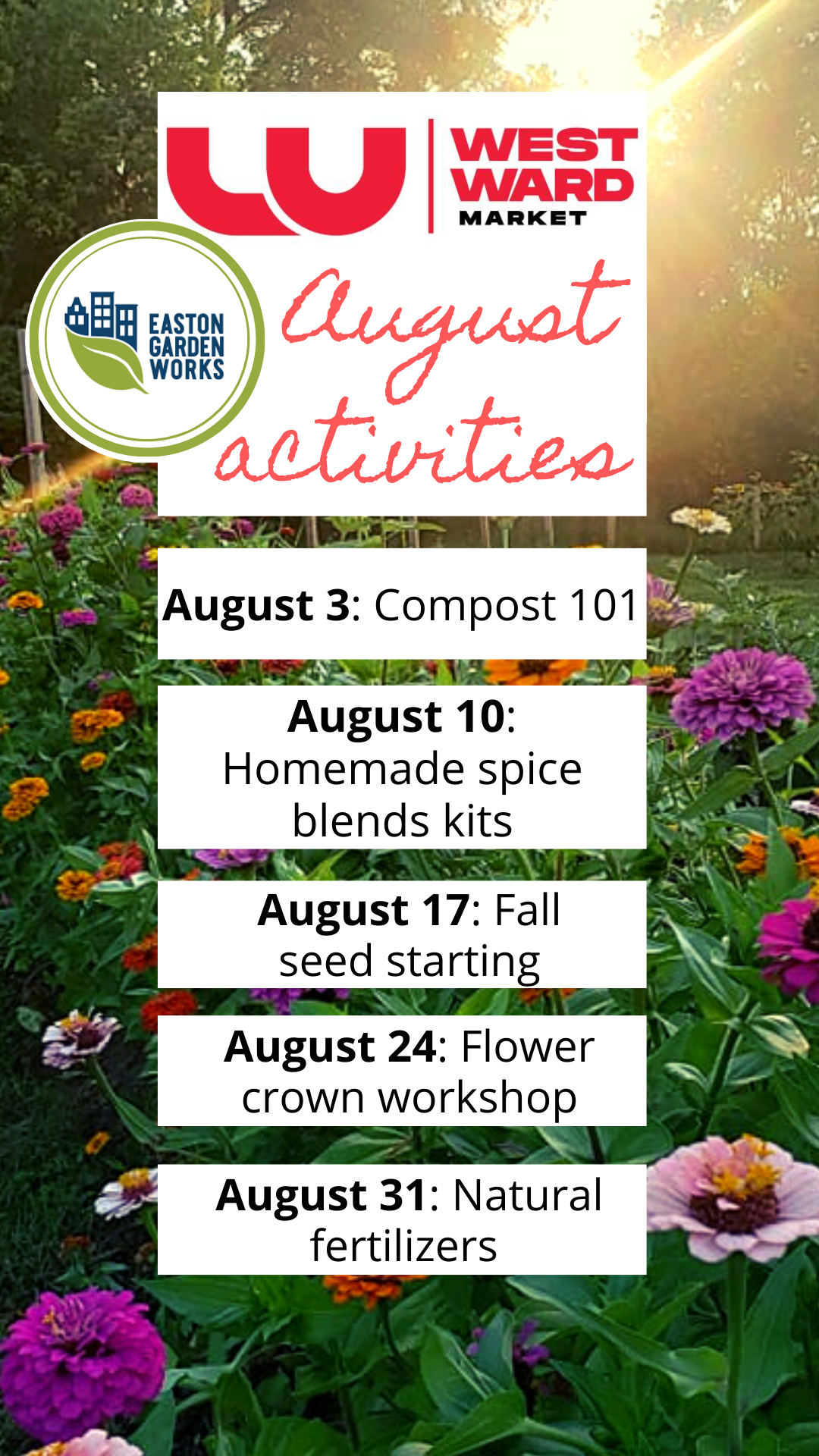 Another Easton Garden Works’ signature flower crown workshops! Lots of zinnias, sunflowers, wildflowers, and weeds peppered everyone’s crowns this week. Even more was in bloom as compared to July: we had ornamental onion, kale, Mexican sunflower, okra flowers, and more to add to the mix.