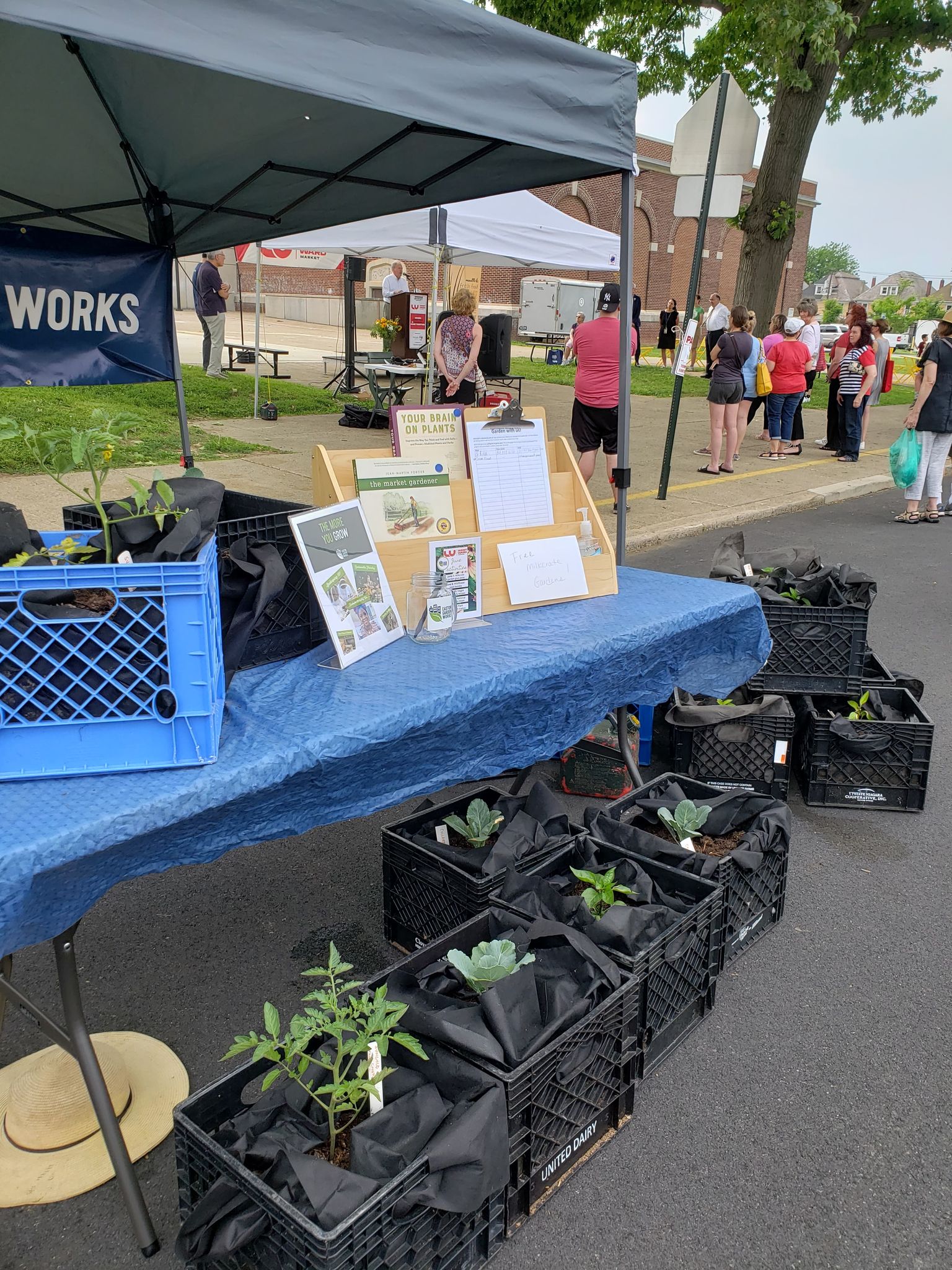 Our annual free milkcrate garden give-away was hosted this year at the West Ward Market. The design is simple, and we hope it inspires residents to duplicate them. Hard plastic milkcrates (donated second-hand by local businesses) are lined with burlap or landscaping fabric, filled with mushroom compost, and finished with a plant we grew from seed. This year, we distributed two types of tomato plants, two types of peppers, tomatillos, and herbs like parsley and cilantro.